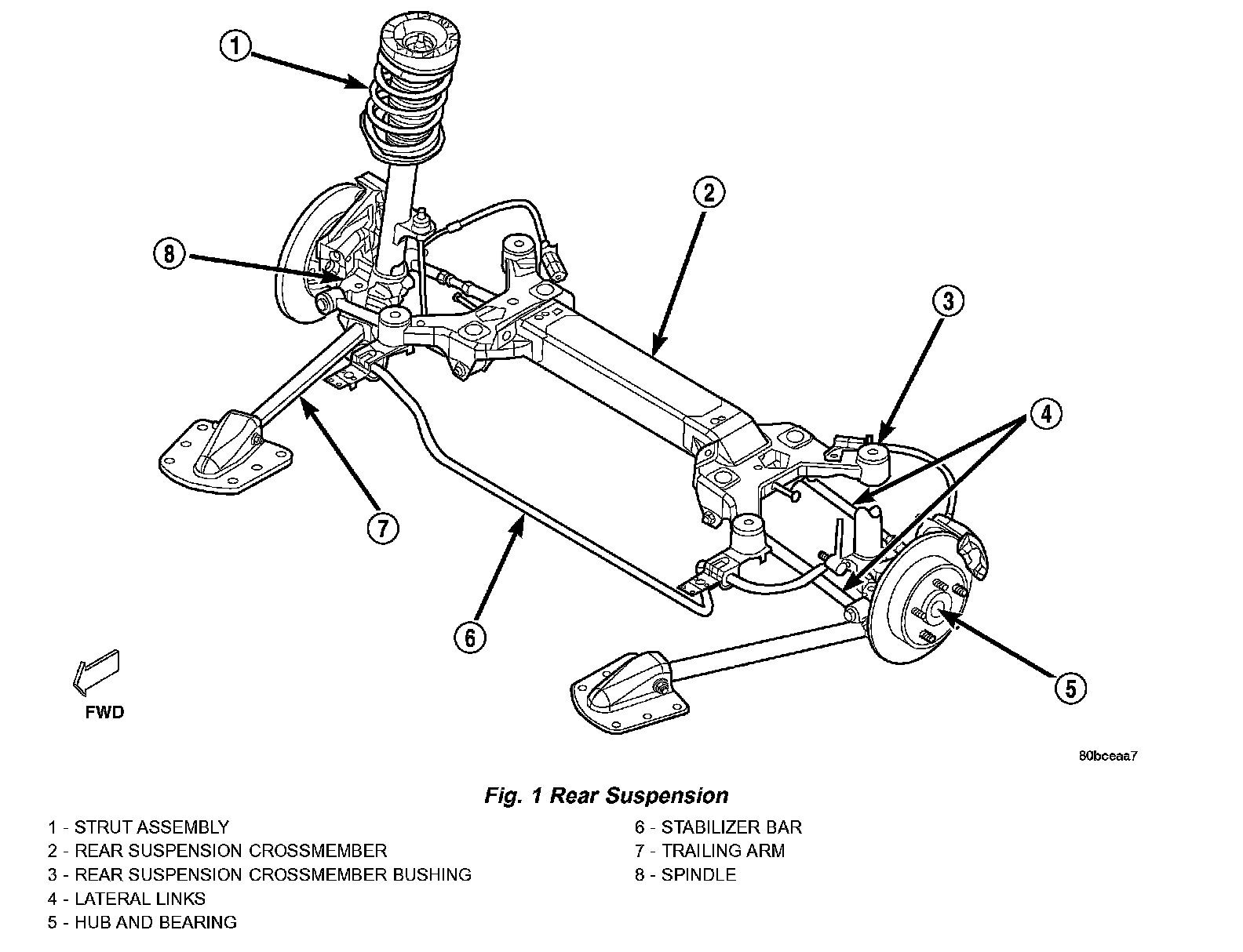 The lateral movement of the rear spindle is controlled by the lateral links connecting the front and rear centerline of the spindle to the rear suspension crossmember. The threaded adjustment sleeve of the rear link allows for setting rear wheel alignment toe adjustment.