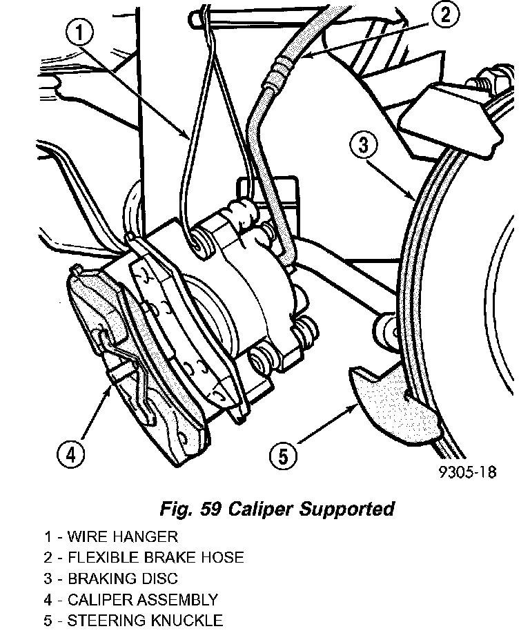 7. Remove brake caliper assembly from steering knuckle and brake rotor. Support caliper assembly by hanging it from frame of vehicle with wire or some other method. Do not let caliper assembly hang by brake hose.