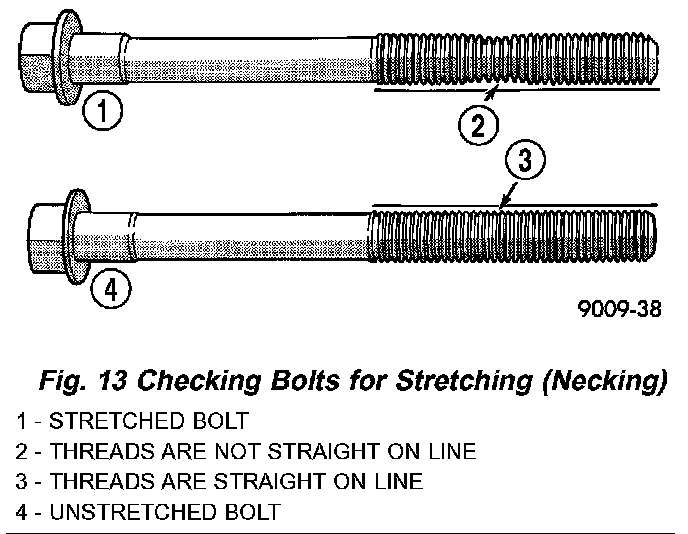 INSTALLATIONThe cylinder head bolts are tightened using a torque plus angle procedure. The bolts must be examined BEFORE reuse. If the threads are necked down the bolts must be replaced (Fig. 13).