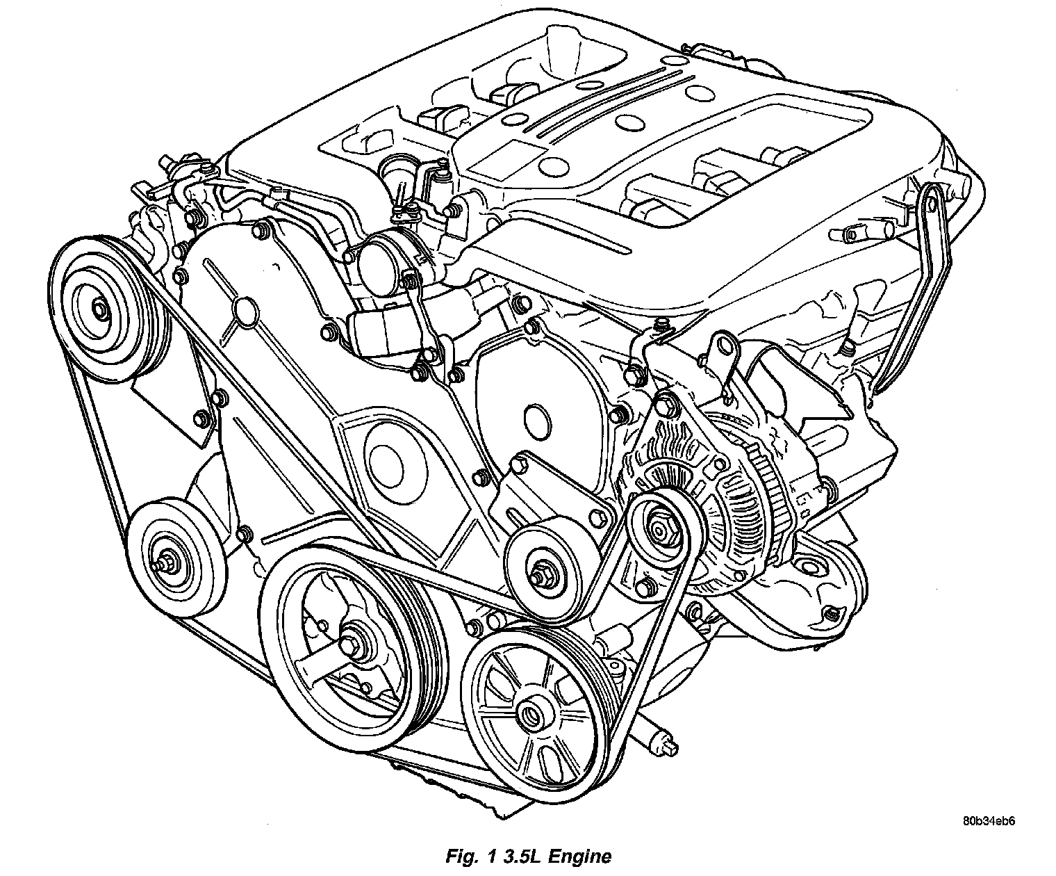 DESCRIPTIONThe 3.5 Liter (214 Cubic Inches) 60 degree V-6 engines is a single overhead camshaft design with hydraulic lifters and four valves per cylinder (Fig. 1). The engine does not have provisions for a free wheeling valve train.
