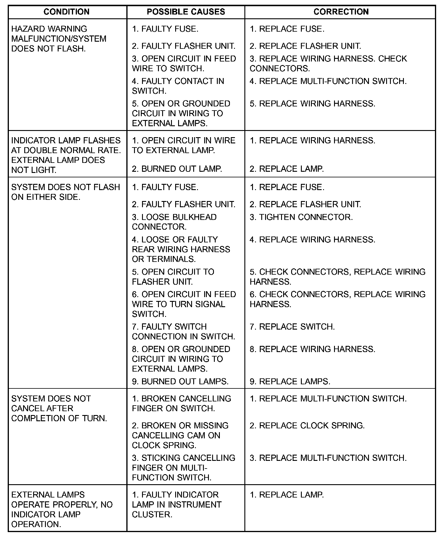 The multi-function switch contains electrical circuitry for turn signal, hazard warning, headlamp beam select, headlamp optical horn, windshield wiper, pulse wipe, and windshield washer switching. Refer to Electrical, Wipers/Washers, Description and Operation for wiper and washer functions. This integrated switch assembly is mounted to the left hand side of the steering column. Should any function of the switch fail, the entire switch assembly must be replaced. Refer to the COMBINATION FLASHER DIAGNOSIS table.