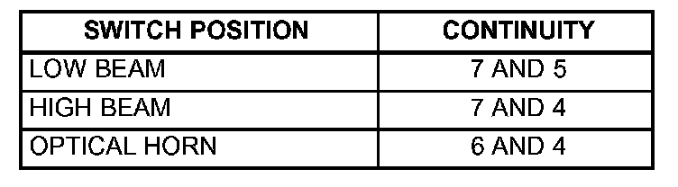 To test the switch, the switch must first be removed. Refer to Multi-function Switch REMOVAL and INSTALLATION. Using an ohmmeter, test for continuity (no resistance) between the terminals of the switch as shown in the TURN SIGNAL AND HAZARD SWITCH CONTINUITY table, BEAM SELECT SWITCH CONTINUITY table.