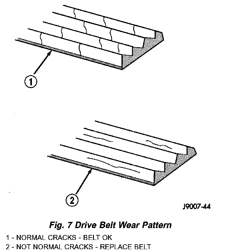 Poly-V Belt system may develop minor cracks across the ribbed side (due to reverse bending). These minor cracks are considered normal and acceptable. Parallel cracks are not (Fig. 7).
