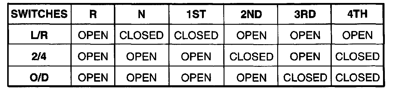 Theory of Operation: The Transmission system uses three pressure switches to monitor the fluid pressure in the LR, 2/4, and OD elements. The pressure switches are continuously monitored for the correct states in each gear as shown.