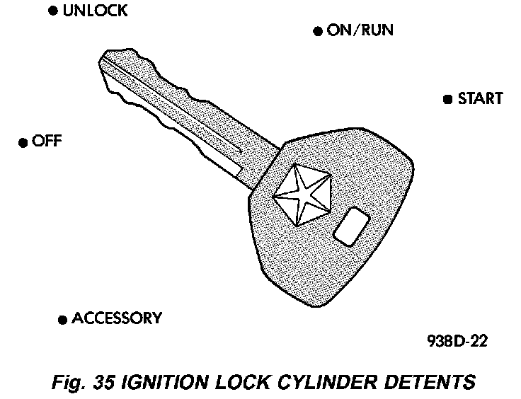 The ignition key rotates the cylinder to 5 different detents (Fig. 35):