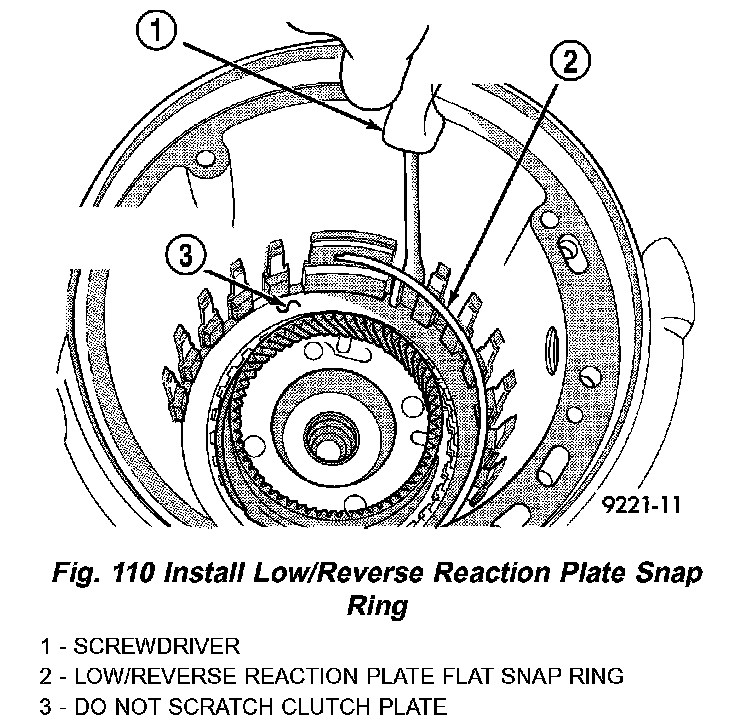 24. Install low/reverse reaction plate snap ring (Fig. 110).