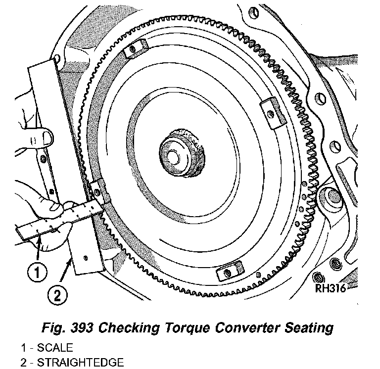 6. Check converter seating with a scale and straightedge (Fig. 393). Surface of converter lugs should be 1/2 inch to rear of straightedge when converter is fully seated.