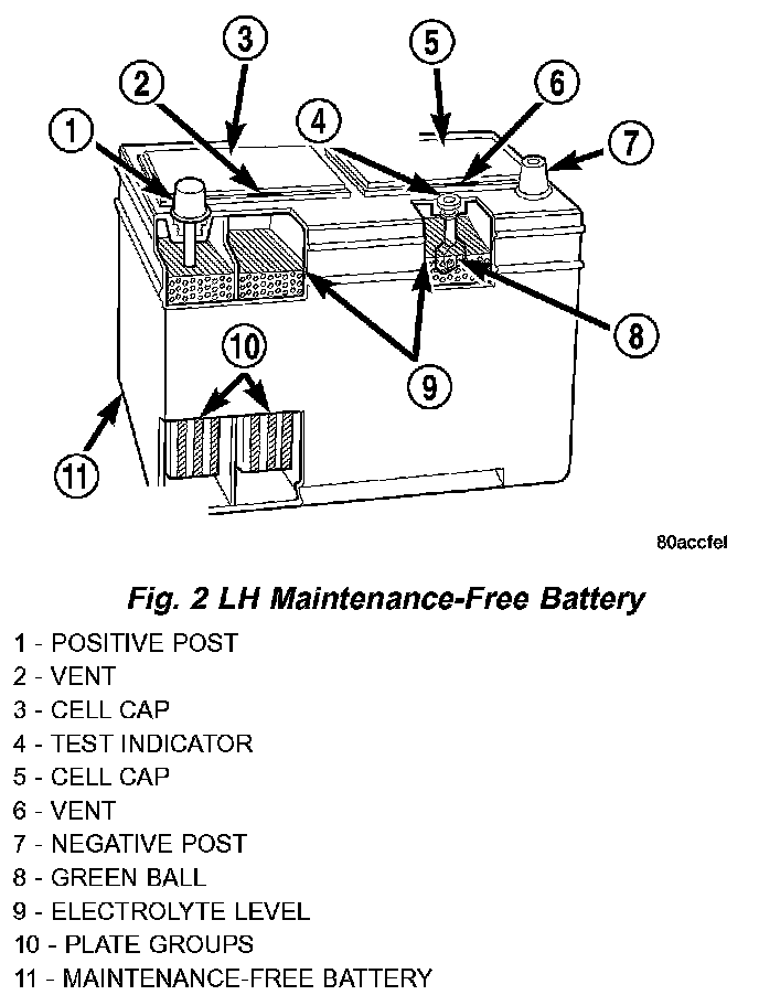 Maintenance-free batteries have non-removable battery vent caps (Fig. 2). Water cannot be added to this battery Under normal service the composition of this battery reduces gassing and water loss at normal charge rates. If the battery electrolyte level becomes low, this battery must be replaced.