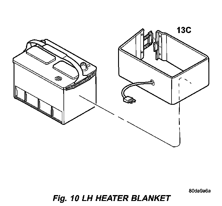 A heater blanket (Fig. 10) is used to improve the battery cold-start ability. This blanket operates on 110 volt AC current and is used with Alaska and Canada cold weather packages.