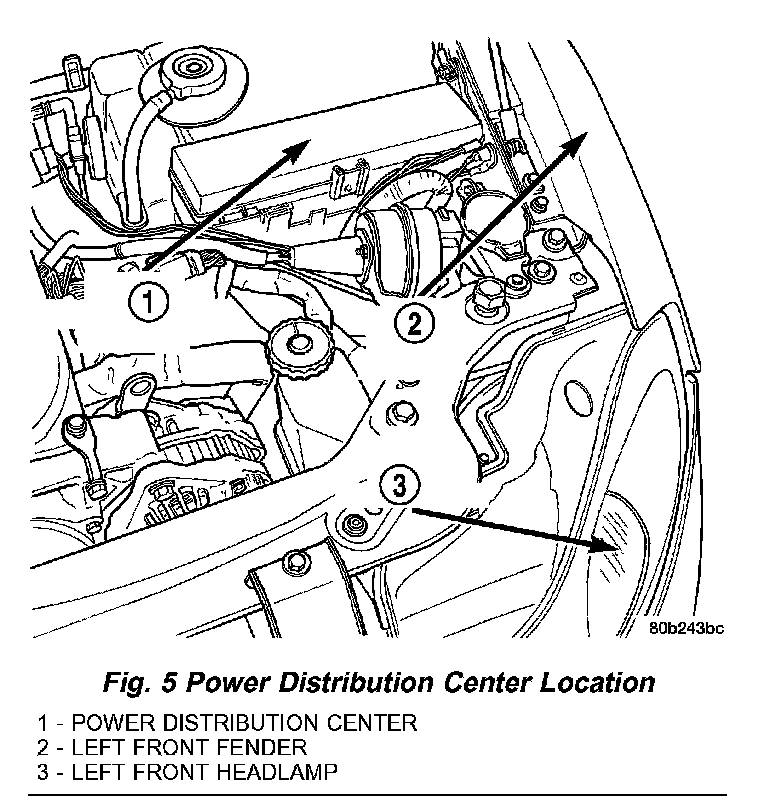 All of the electrical current distributed throughout this vehicle is directed through the standard equipment Power Distribution Center (PDC) (Fig. 5). The molded plastic PDC housing is located in the left front corner of the engine compartment, just in front of the coolant reservoir bottle. The PDC housing has a molded plastic cover. The PDC cover is easily removed for service access and has a convenient fuse and relay layout label affixed to the inside surface of the cover to ensure proper component identification. The PDC housing is secured in the engine compartment by one screw to the rear of the PDC and two clips on the front side. A small molded plastic protective cover on the front right side of the engine compartment is unsnapped to access the battery/generator cable input connection studs.