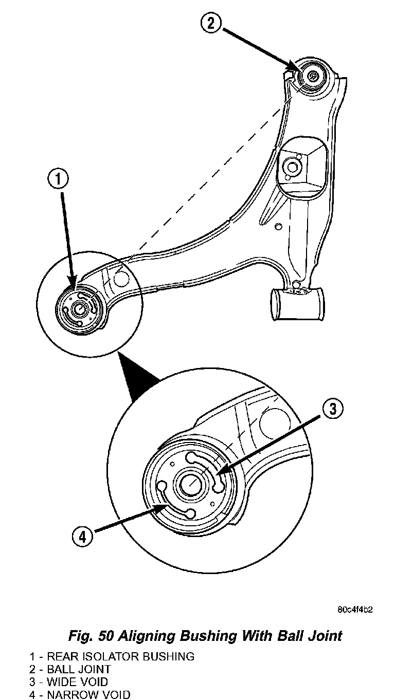 2. Start the isolator bushing into the bottom of the lower control arm bushing bore by hand. Position the bushing so the voids in the rubber are aligned in relationship to the ball joint as shown (Fig. 50). Place the larger void toward the ball joint.
