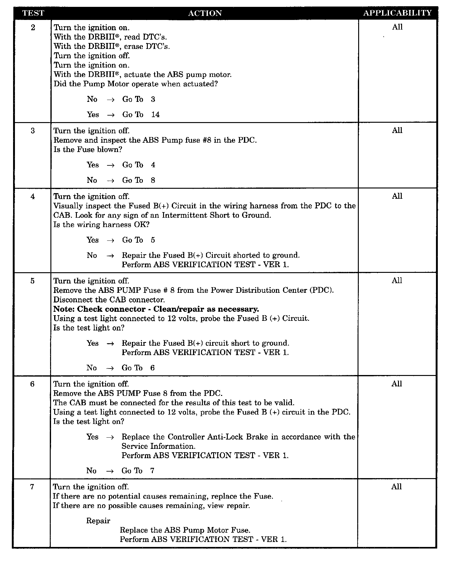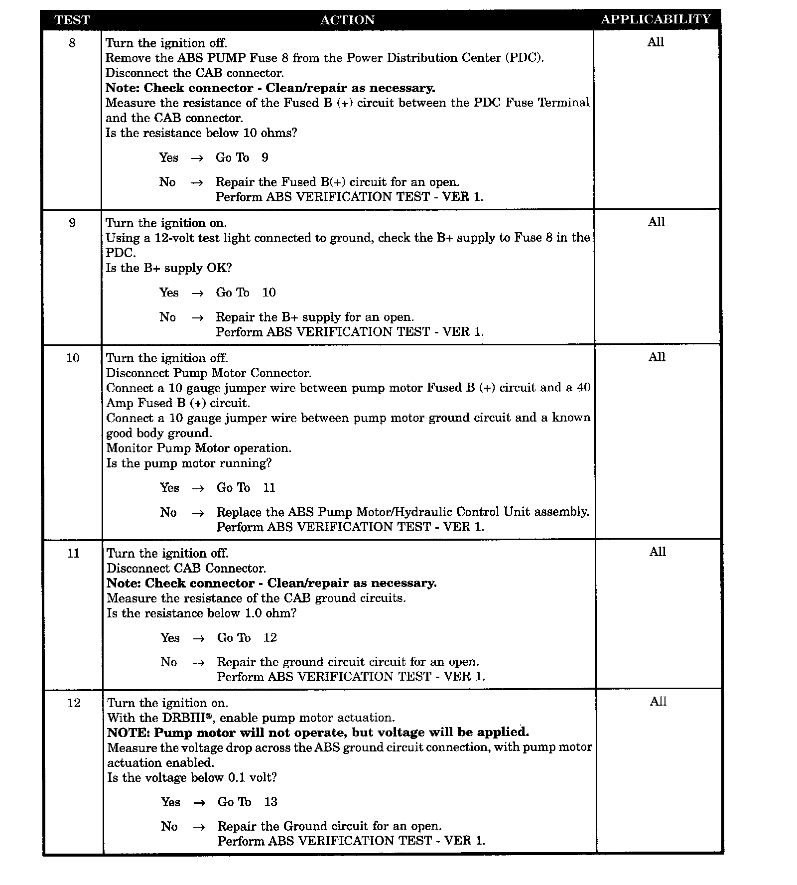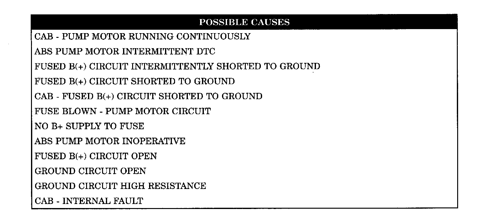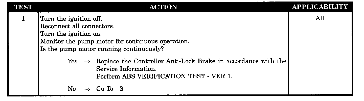 When Monitored: Ignition on. The CAB commands the pump on at 20 km/h (12 mph) to check its operation, if the brake switch is not applied. If the brake is applied, the test will run at 40 km/h (25 mph). The CAB monitors pump voltage every 7 milliseconds.