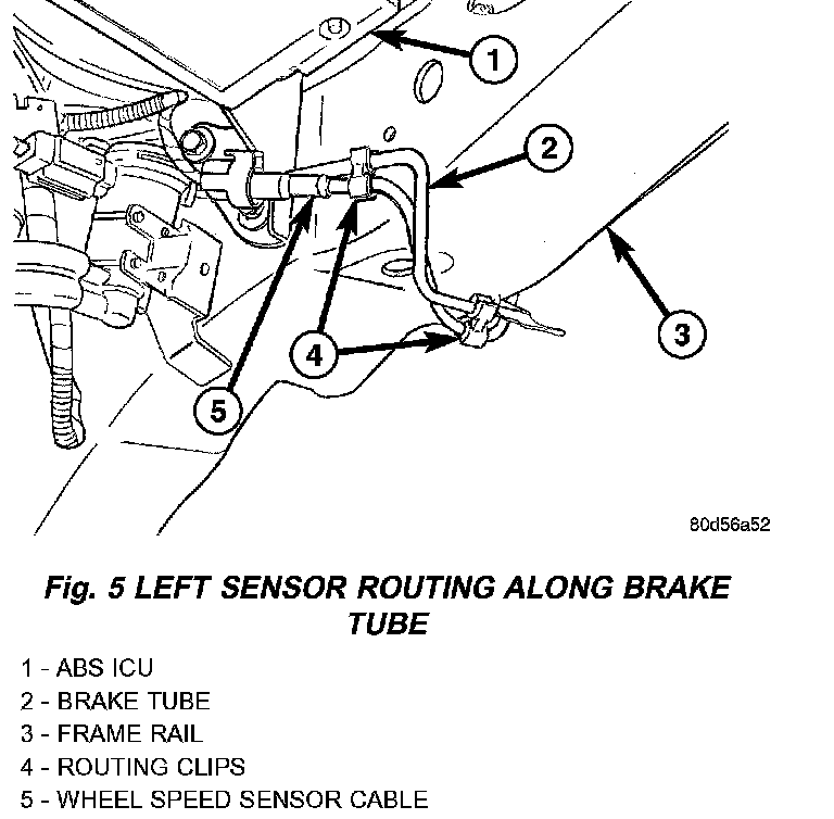 5. If the sensor being installed is the left front, clip the speed sensor cable to the brake tube on the inside of and under the frame rail.