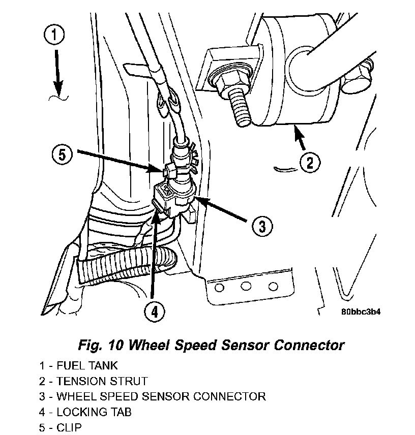 2. Disconnect the wheel speed sensor cable connector from the vehicle wiring harness. Remove the clip attaching wheel speed sensor cable connector to the vehicle's body.