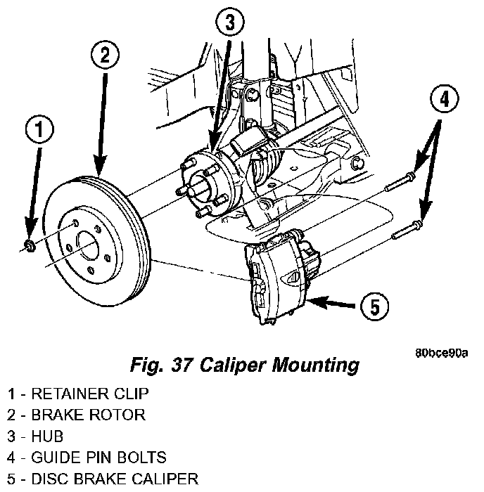 5. Remove the two brake caliper to steering knuckle guide pin bolts.