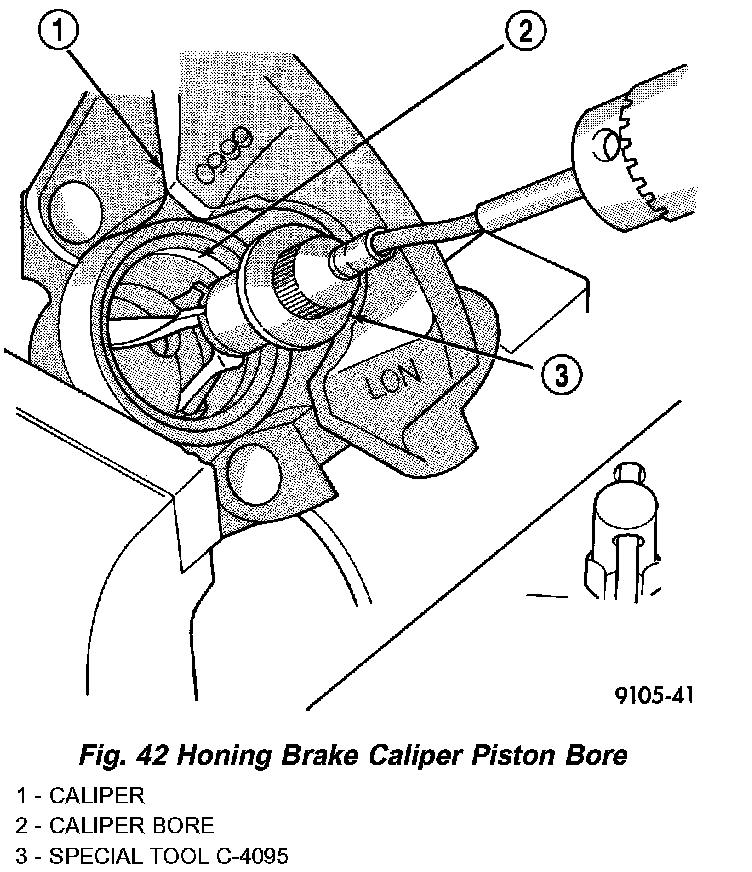 NOTE: During the honing procedure, coat the stones and bore with brake fluid. After honing the bore, carefully clean the seal and boot grooves with a stiff non-metallic rotary brush. Use extreme care in cleaning the caliper after honing. Remove all dirt and grit by flushing the caliper bore with fresh clean brake fluid; wipe it dry with a clean, lint free cloth and then clean it a second time.