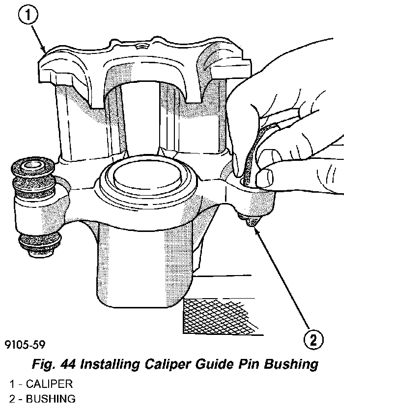 CAUTION: Use care when installing the caliper assembly onto the steering knuckle so the seals on the caliper guide pin bushings do not get damaged by the steering knuckle bosses.