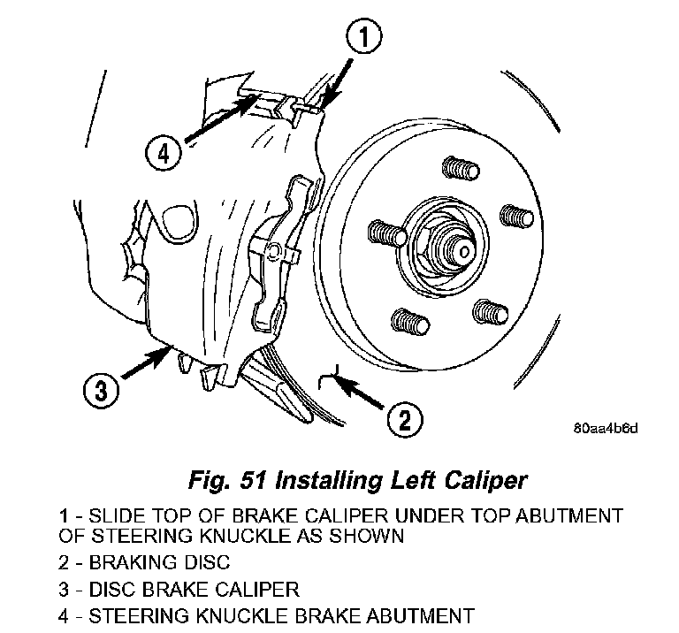 3. Install the disc brake caliper (with pads) on the brake rotor and steering knuckle. The left side caliper is installed by first sliding the top of the caliper past the top caliper slide abutment on the steering knuckle to hook the top edge of the caliper, then pushing the lower end of the caliper into place against the knuckle. The right side caliper is installed by first sliding the bottom edge of the caliper past the lower caliper slide abutment on the steering knuckle to hook the lower edge of the caliper, then pushing the top of the caliper into place against the steering knuckle.