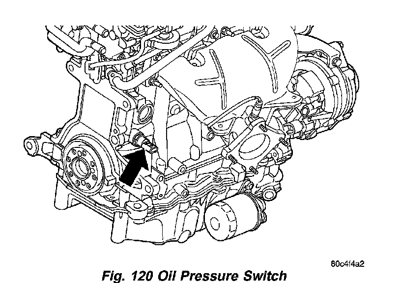 The oil pressure switch is located on the right rear side of the engine block (Fig. 120). The oil pressure switch is a pressure sensitive switch that is activated by the engine's oil pressure (in the main oil gallery). The switch is a two terminal device (one terminal is provided to the wiring harness and the other terminal is the switch's metal housing that screws into the engine block).