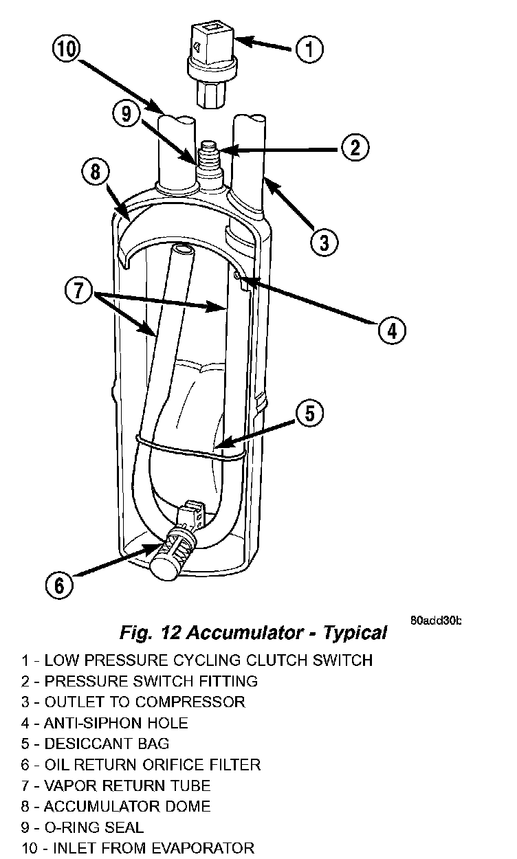 The accumulator is mounted in the engine compartment between the evaporator outlet and the compressor suction port.