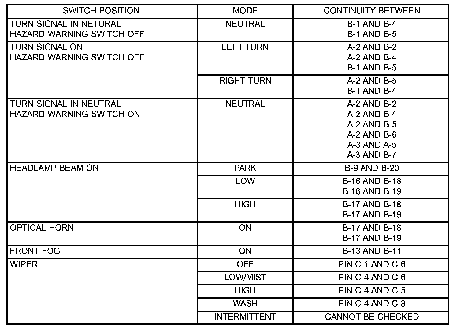 Using an ohmmeter, test for continuity (no resistance) between the terminals of the switch as shown in the Multi-Function Switch Continuity Test table for diagnosis. Refer to,, and for connector terminal locations.