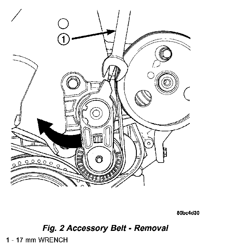 2. Using a 17 mm wrench, rotate belt tensioner clockwise (Fig. 2) until belt can be installed on the power steering pulley Release spring tension onto belt.