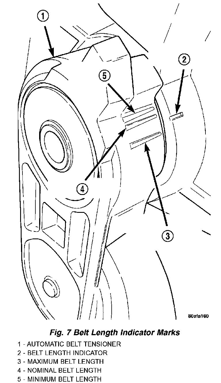 3. After belt is installed, inspect belt length indicator marks (Fig. 7). The indicator mark should be within the minimum belt length and maximum belt length marks. On a new belt, the indicator mark should align approximately with the nominal belt length mark.