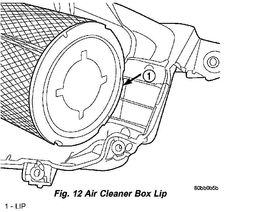 6. Install air cleaner element on to throttle body and push towards the throttle body and past lip in air cleaner box bottom (Fig. 12).