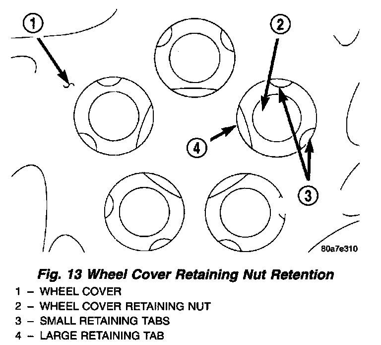 NOTE: The retaining nut flange cannot be forced past the large retaining tab. When removing the retaining nut from wheel cover, the flange on the nut must instead be forced past the 2 small retaining tabs.