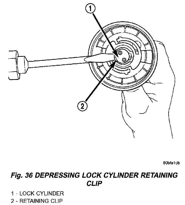 4. Depress the spring loaded lock cylinder retaining clip (Fig. 36) and remove the lock cylinder from the cap (Fig. 37).