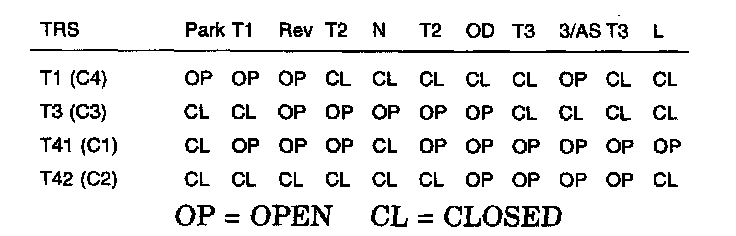 Theory of Operation: The C1 through C4 (T1, T3, T41, and T42) sense circuits communicate the shift lever position to the TCM. Each circuit is terminated at the transmission with a switch. Each switch can be either open or closed, depending on the shift lever position. The TCM can decode this information and determine the shift lever position. Each shift lever position has a certain combination of switches which will be open and closed, this is called a PRNDL code. There are 4 switches, therefore: there are many possible combinations of open and closed switches (codes). However, there are only 9 valid codes (8 for AutoStick), one for each gear position and three recognized between gear codes. The remainder of the codes should never occur, these are called invalid codes. The chart shows the normal switch states for each shift lever position.
