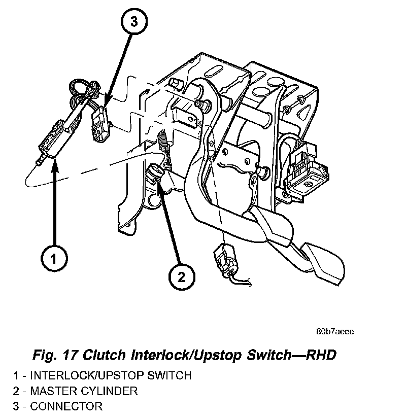 The RHD clutch interlock/upstop switch (Fig. 17) consists of a single, multi-function switch that is activated by the hydraulic clutch master cylinder push rod.