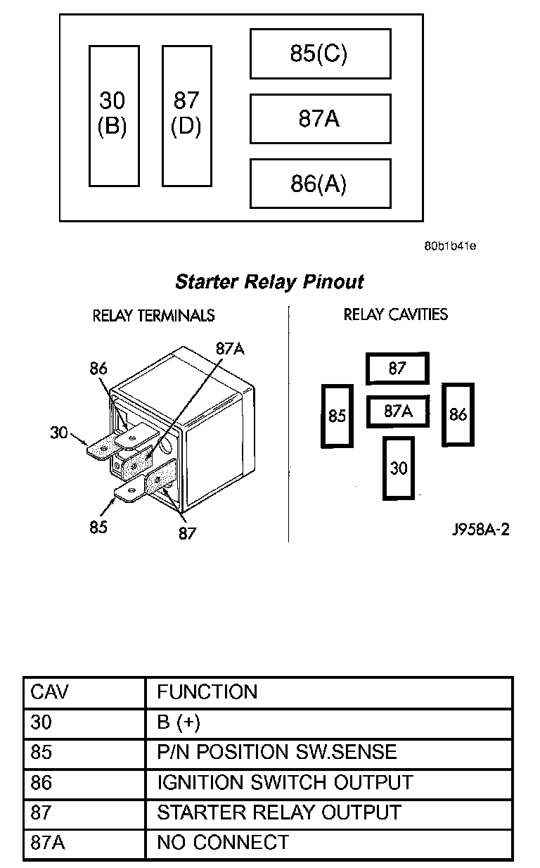 3. Connect a battery B+ lead to terminals 86 and a ground lead to terminal 85 to energize the relay. The relay should click. Also test for continuity between terminals 30 and 87, and no continuity between terminals 87A and 30. If OK, refer to Relay Circuit Test procedure. If not OK, replace the faulty relay.