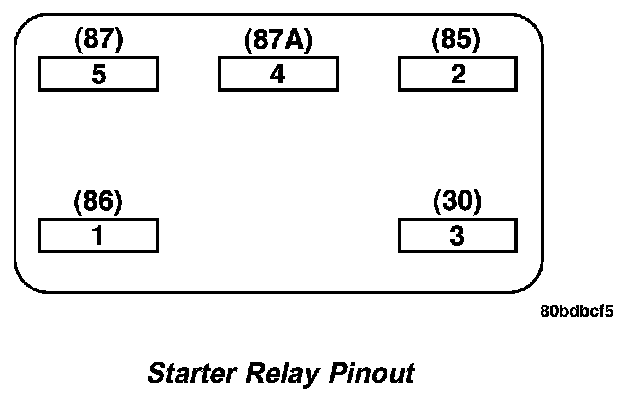 4. The coil battery terminal (86) is connected to the electromagnet in the relay. It is energized when the ignition switch is held in the Start position and the clutch pedal is depressed (manual trans). Check for battery voltage at the cavity for relay terminal 86 with the ignition switch in the Start position and the clutch pedal is depressed (manual trans), and no voltage when the ignition switch is released to the ON position. If OK, go to Step 5. If not OK, check for an open or short circuit to the ignition switch and repair, if required. If the circuit to the ignition switch is OK, see the Ignition Switch Test procedure.