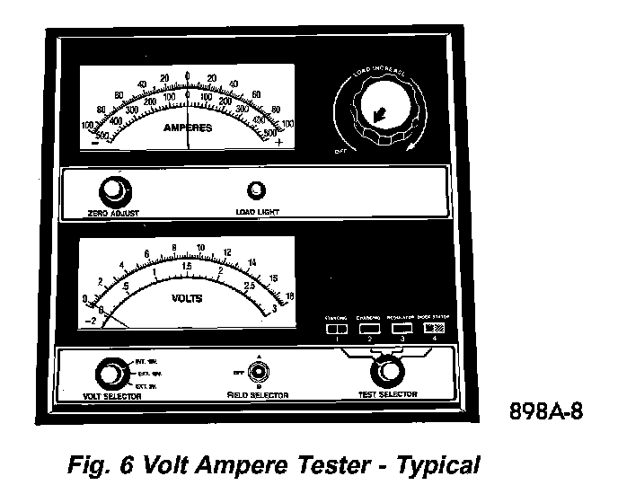5. Rotate and hold the ignition switch in the START position. Observe the volt-ampere tester (Fig. 6).