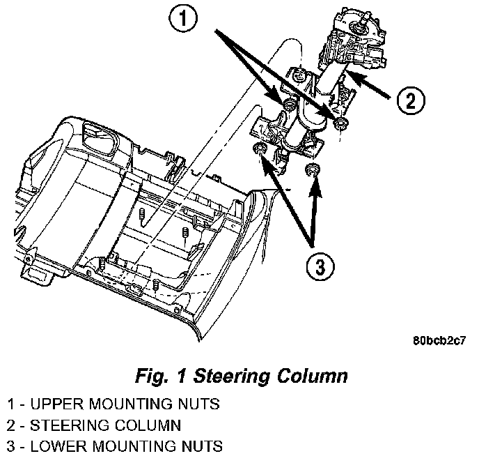 6. Align the slots in the mounting brackets on the steering column with the studs in the instrument panel Attach the column to the instrument panel by first installing the two upper mounting nuts (Do not completely tighten the two upper mounting nuts at this time). Next, install the two lower mounting nuts. Tighten all four mounting nuts to a torque of 17 Nm (150 inch lbs.).