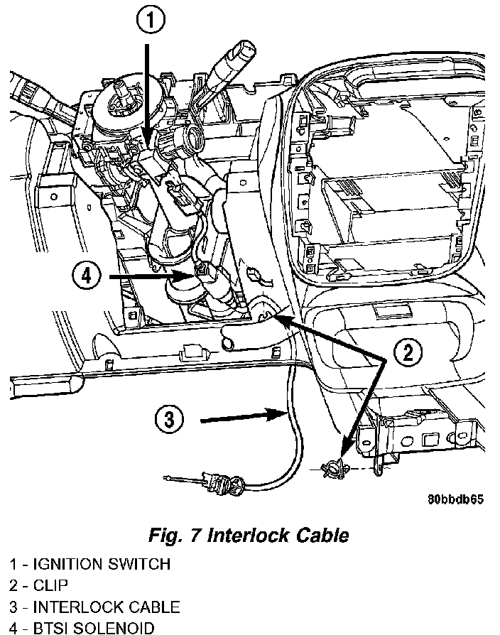 17. If the vehicle is equipped with a automatic transaxle, disconnect the automatic transaxle ignition interlock cable from the steering column. Depress the tab on top of the cable connector and remove the cable from the back side of the steering column ignition cylinder housing.