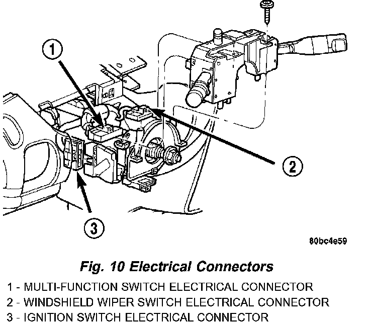 4. Connect the wiring harness electrical connectors to the multi-function switch, windshield wiper switch, and ignition switch.