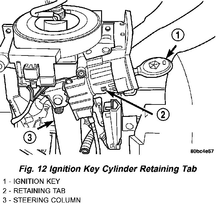 e. Install the ignition key cylinder in the steering column. To do this, first position the key cylinder in the ON position (with the key in it) so the retaining tab can be depressed. Push key cylinder into the column ignition cylinder housing until the retaining tab locks into place.