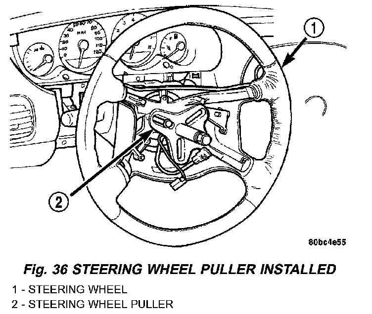 7. Remove the steering wheel with a steering wheel puller. While removing the steering wheel take care to feed the wires gently through the holes in the steering wheel.