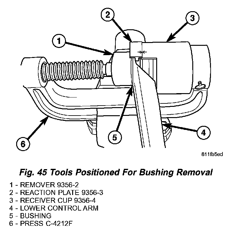 4. Place the Reaction Plate (on the lower control arm) against the outer flange of the Receiver Cup as shown (Fig. 45). Line up the arrows on the Reaction Plate with that on the Receiver Cup and tighten the Press screw-drive until the Remover contacts the outer circumference of the bushing (Fig. 45). Make sure the Remover contacts the bushing circumference evenly all the way around.