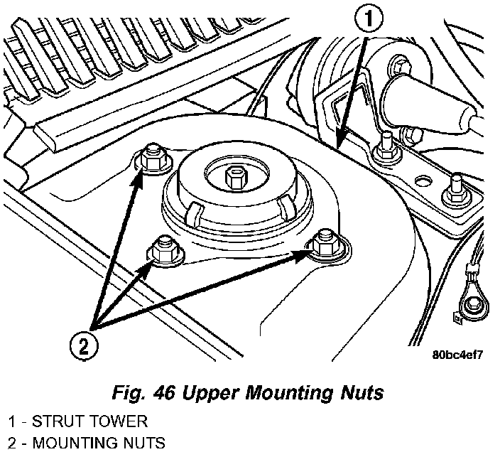 1. Install the strut assembly into the strut tower, aligning the three studs on the strut upper mount with the holes in strut tower. Install the three mounting nuts on the studs. Tighten the three nuts to a torque of 34 Nm (300 inch lbs.).