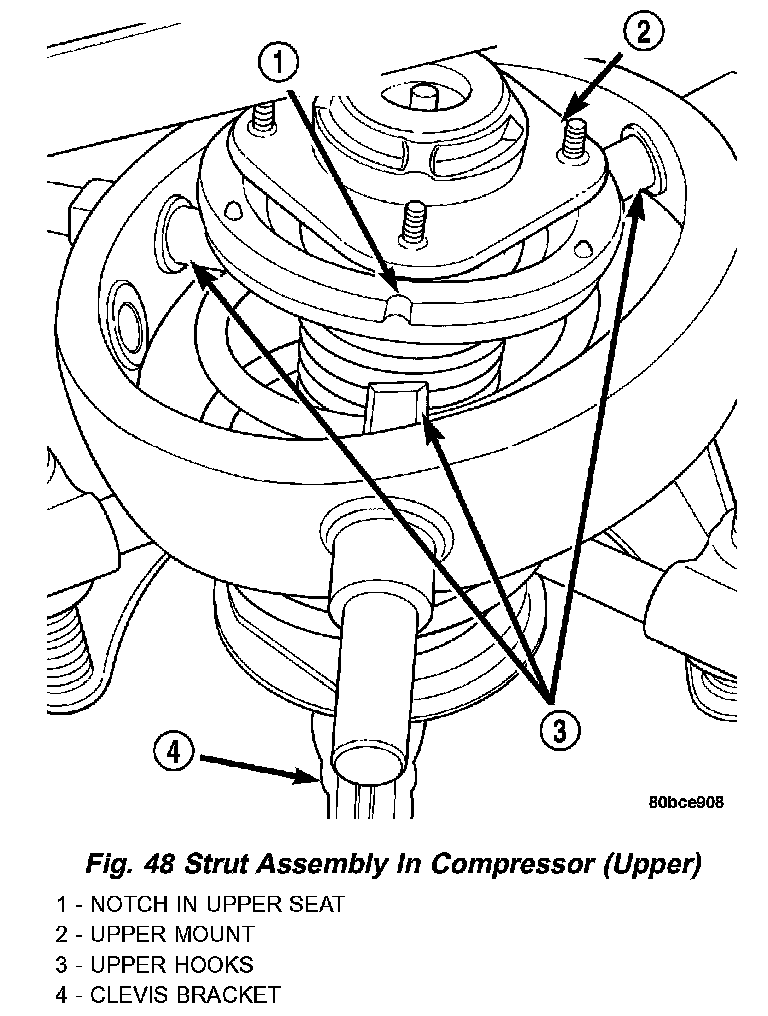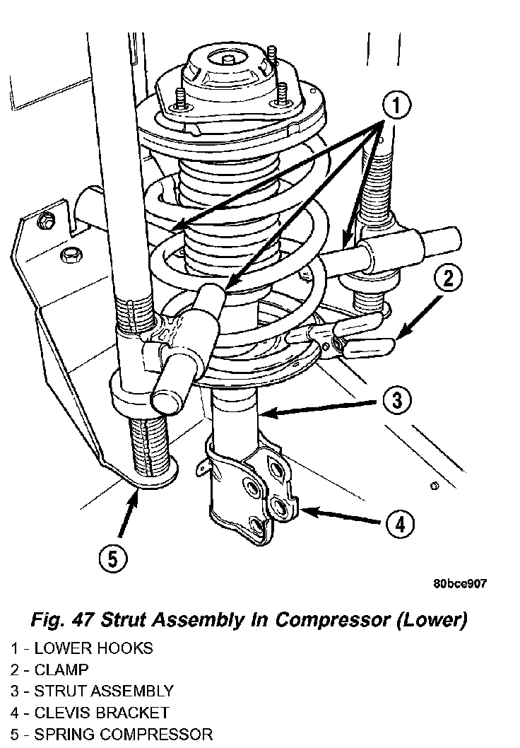 For the disassembly and assembly of the strut assembly, use strut spring compressor, Pentastar Service Equipment (PSE) tool W-7200, or the equivalent, to compress the coil spring. Follow the manufacturer's instructions closely.