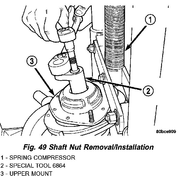 WARNING: DO NOT REMOVE THE STRUT SHAFT NUT BEFORE THE COIL SPRING IS COMPRESSED. THE COIL SPRING IS HELD UNDER PRESSURE AND MUST BE COMPRESSED, REMOVING SPRING TENSION FROM THE UPPER MOUNT AND PIVOT BEARING, BEFORE THE SHAFT NUT IS REMOVED.