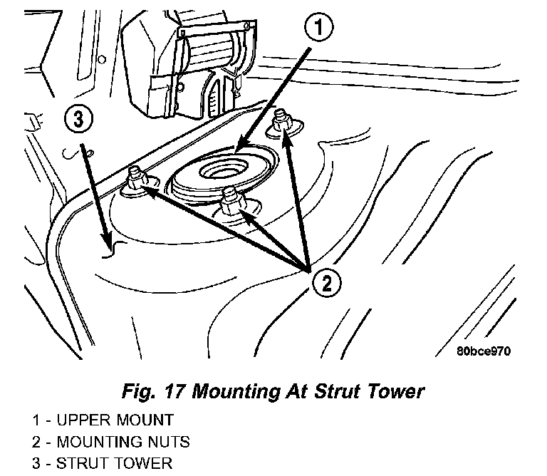 8. Lower the vehicle just enough to access the luggage compartment without letting the tires touch the floor. Access to rear upper strut mount attaching bolts is through the luggage compartment.