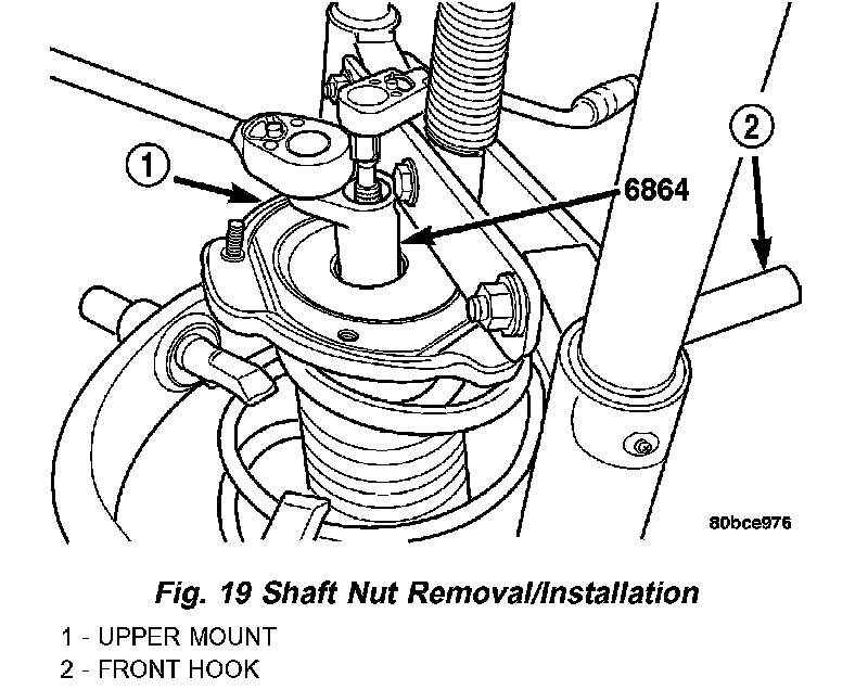 WARNING: DO NOT REMOVE THE STRUT SHAFT NUT BEFORE THE COIL SPRING IS COMPRESSED. THE COIL SPRING IS HELD UNDER PRESSURE AND MUST BE COMPRESSED, REMOVING SPRING TENSION FROM THE UPPER MOUNT AND PIVOT BEARING, BEFORE THE SHAFT NUT IS REMOVED.