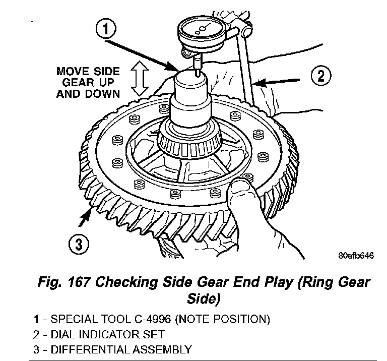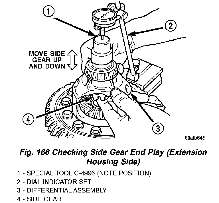 5. Set up dial indicator set C-3339 and tool C-4996 as shown in (Fig. 166) (Fig. 167) to measure side gear end play. Side gear end play must be within 0.001 - 0.013 inch.