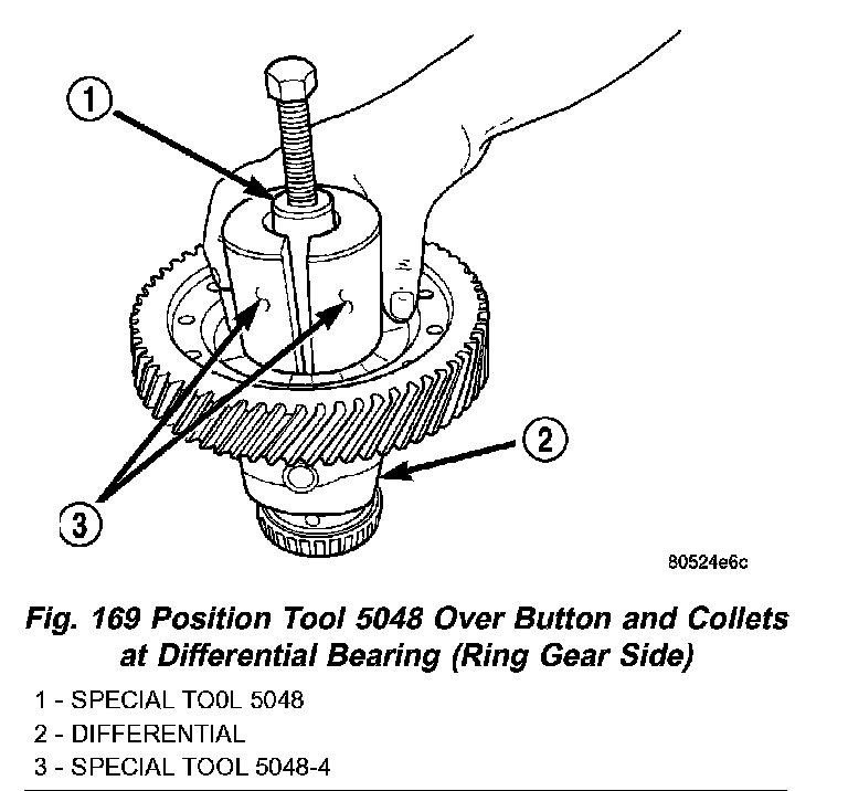 7. Use Miller Special Tool 5048, 5048-4 Collets, and L-4539-2 Button to remove the differential bearing cone on the bearing retainer side (Fig. 168) (Fig. 169) (Fig. 170).