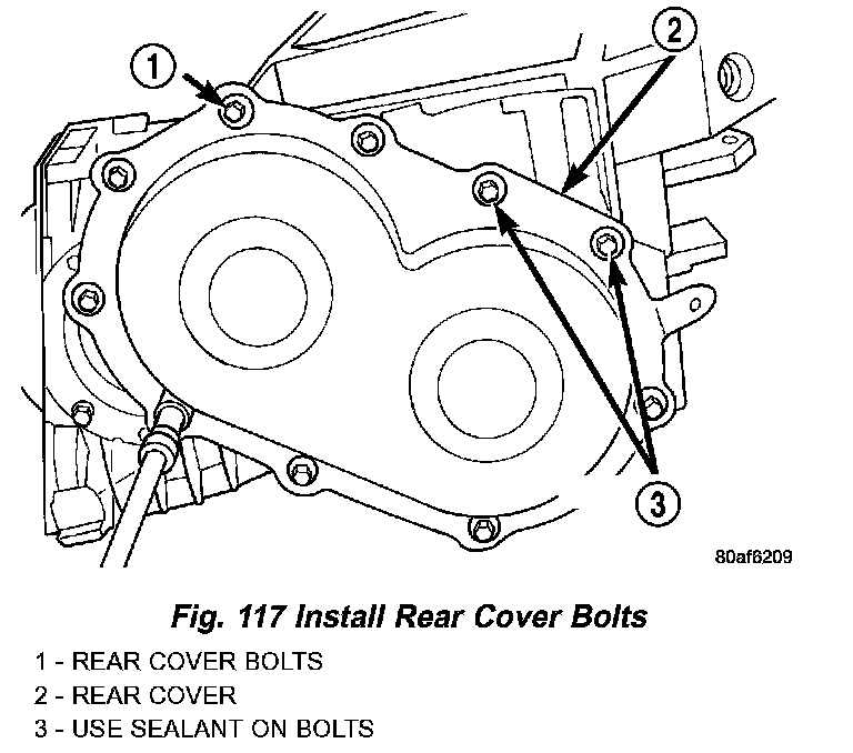 36. Install a bead of Mopar ATF RTV (MS-GF41) to transfer gear cover (Fig. 116).