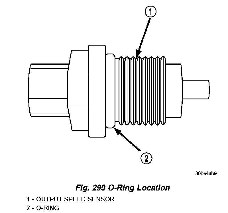 The Output Speed Sensor is a two-wire magnetic pickup device that generates an AC signal as rotation occurs. It is threaded into the transaxle case (Fig. 298), sealed with an O-ring (Fig. 299), and is considered a primary input to the Transmission Control Module (TCM).